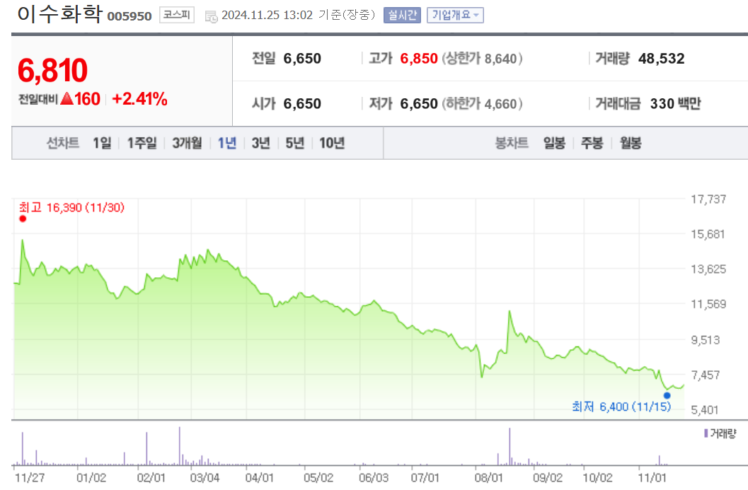 이수화학의 현재 주가는 6,650원입니다. 전일 대비 -15.29원 이동한 모습입니다. 시가 총액은 1547억 원이며 발행 주식은 총 22,722,739주 입니다. 외국인이 보유한 비중은 1.34%입니다.
