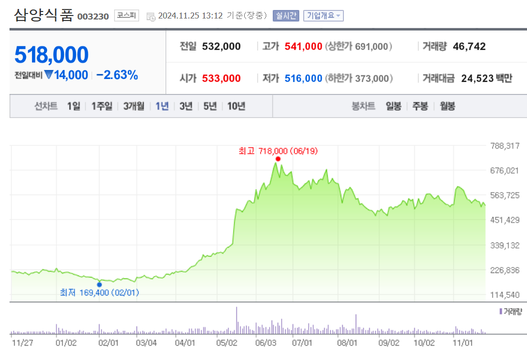 만약 단기 포트폴리오를 구성한다면 시가 총액과 장중 거래량을 살펴봐야 합니다. 삼양식품의 시가 총액은 3조9247억 원이며 장중 거래량은 53,296원 을 기록했습니다. 대주주의 정보는 중요하지 않을 수도 있지만 장기적인 관점에서는 확인이 필요합니다.