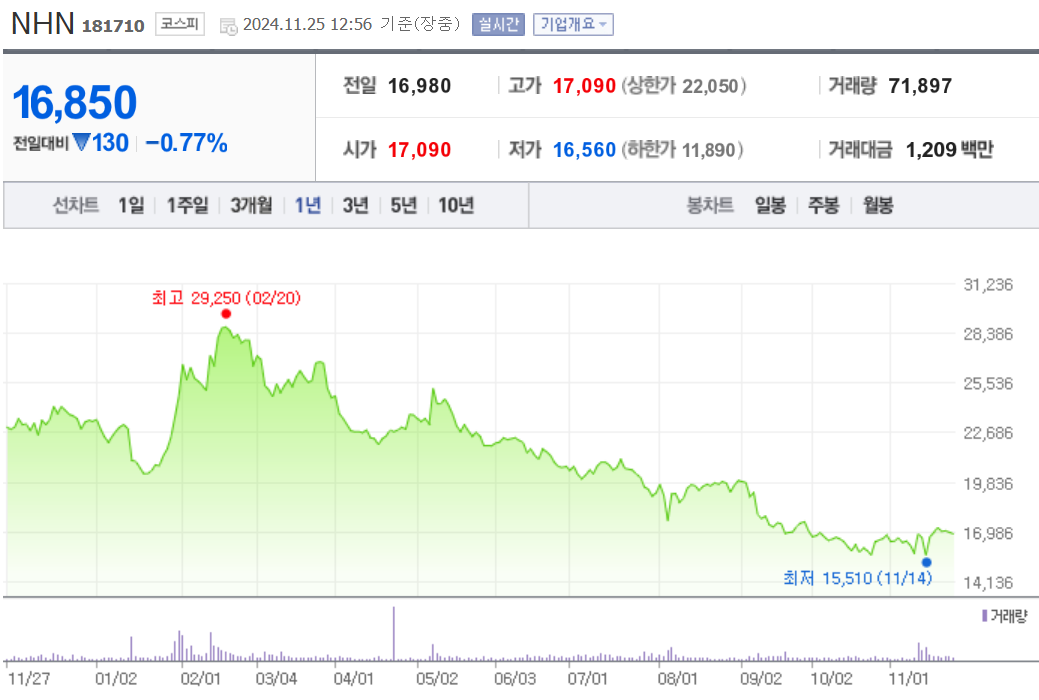 NHN의 현재 주가는 16,980원입니다. 전일 대비 -90원 이동한 모습입니다. 시가 총액은 5690억 원이며 발행 주식은 총 33,766,123주 입니다. 외국인이 보유한 비중은 10.10%입니다.